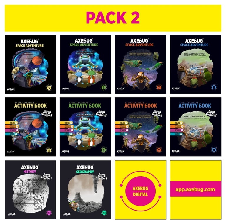 Axebug Comics is prepared for four different grade levels: PACKAGE 1, PACKAGE 2, PACKAGE 3, PACKAGE 4. The packages are used according to the grade level. For example, 4th-grade students start with PACKAGE 1, when they reach 5th grade, they use PACKAGE 2, for 6th grade, they use PACKAGE 3, and for 7th grade, they use PACKAGE 4. The package changes as the grade level increases. Axebug Comics packages are designed for A1-A2-B1 proficiency levels.